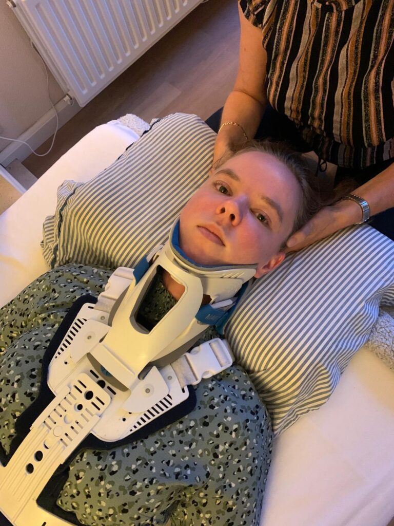 Mijn naam is Esmée de Groot en ik ben 27 jaar. Ik ben zeer ernstig ziek. Ik heb het Ehlers Danlos Syndroom (EDS), de klassieke variant. Daarbij heb ik ook onder andere POTS, ME, MCAS (zie voor uitleg over deze ziekten het kopje ‘Ziekteninfo’) en een ontsteking in mijn ruggenmerg. In eenvoudige taal; mijn bindweefsel bindt niet en bindweefsel zit in alle delen van het lichaam. Hierdoor heb ik dagelijks gewrichten uit de kom. Ook de wervelkolom is een reeks van gewrichtjes boven elkaar. Die waren bij mij zo slap dat het vastgezet moest worden. Alle wervels zijn met schroeven en stangen aan elkaar vastgezet. Voordat dit is vastgezet raakte ik dagelijks meermaals buiten bewustzijn en stopte ik met ademen. Dit leek opgelost.